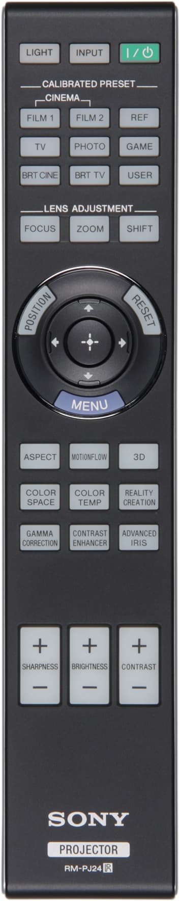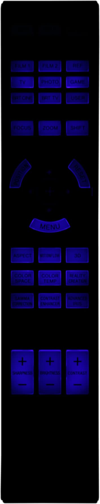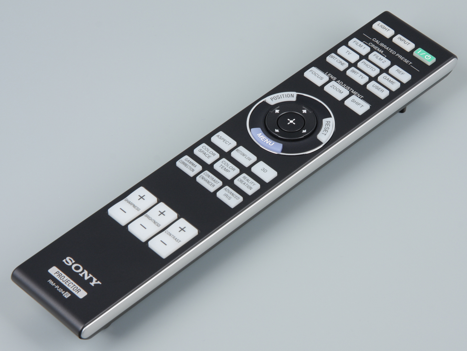 Пульт изготовлен из пластика с матовым черным покрытием. Дизайн выполнен в фирменном стиле, включая продольную ребристость на нижней поверхности. По бокам — вставки из пластика с серебристым покрытием. Пульт удобно лежит в руке. Самые нужные кнопки, включая группу с навигационным кольцом в центре и три кнопки-качалки, легко находятся на ощупь. Есть достаточно яркая синяя светодиодная подсветка всех кнопок, кроме трех в первом ряду, которые фосфоресцируют. Включается подсветка кнопкой Light. В меню можно отключить любой из двух ИК-приемников на самом проекторе.