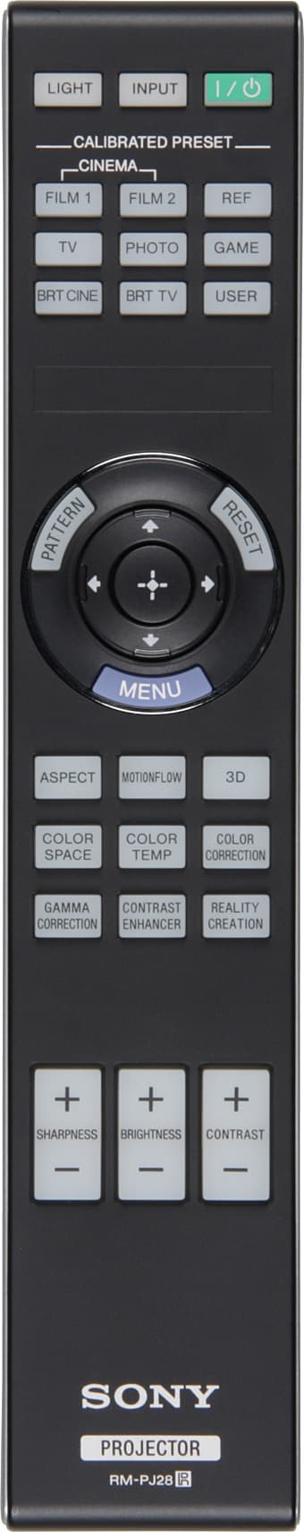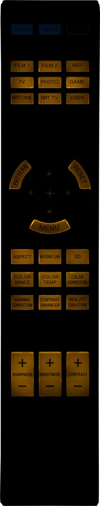 Пульт изготовлен из пластика с матовым черным покрытием. Дизайн выполнен в фирменном стиле, включая продольную ребристость на нижней поверхности и вставки из пластика с серебристым покрытием по бокам. Пульт удобно лежит в руке. Самые нужные кнопки, включая группу с навигационным кольцом в центре и три кнопки-качалки, легко находятся на ощупь. Есть достаточно яркая янтарная (что приятнее синей у пульта от VPL-VW500ES) светодиодная подсветка всех кнопок, кроме трех в первом ряду, которые фосфоресцируют. Включается подсветка кнопкой Light. Этой же кнопкой выключается или гаснет автоматически через несколько секунд. В меню можно отключить любой из двух ИК-приемников на самом проекторе.