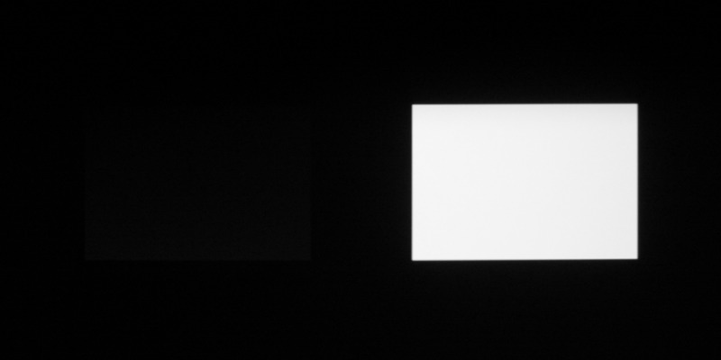 Для тестирования эффективности разделения для глаз мы вывели три тестовых изображения с черным прямоугольником на белом фоне, с белым прямоугольником на черном фоне и со светло-серым прямоугольником на темно-сером фоне. В стереопарах прямоугольники были смещены относительно друг друга, поэтому при просмотре через очки при 100%-ном разделении можно было бы видеть только один прямоугольник. Фотографии ниже сделаны через очки при сигнале 24 кадр/с, при этом экспозиция подбиралась так, чтобы белое поле на фотографиях было максимально ярким, но еще не пересвеченным. Параметр Яркость 3D установлен на высокое и стандартное значение: