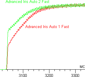 Кроме того, мы исследовали, как работает динамическая диафрагма. В быстром режиме диафрагма срабатывает примерно за 250 мс, в рекомендованном — за 800 мс, а в самом медленном — примерно за 4 с. Диафрагма работает очень тихо, ее слабое шуршание можно услышать, только прижавшись ухом к корпусу проектора. График ниже демонстрирует различие между режимами Авто 1 и Авто 2.