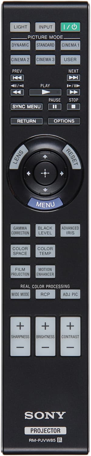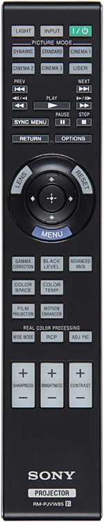 Отличие от пульта к VPL-VW80 заключается только надписях на кнопках выбора профилей изображения, что соответствует измененному набору профилей. Пульт изготовлен из пластика с матовым черным покрытием. Дизайн выполнен в фирменном стиле, включая продольную ребристость на нижней поверхности. По бокам — вставки из пластика с блестящим покрытием под хром. Пульт удобно лежит в руке. Кнопок много (из-за кнопок управления плеером), однако самые нужные, включая группу с навигационным кольцом в центре и три кнопки-качалки, легко находятся на ощупь. Есть достаточно яркая синяя светодиодная подсветка всех кнопок, кроме трех в первом ряду, которые фосфоресцируют.