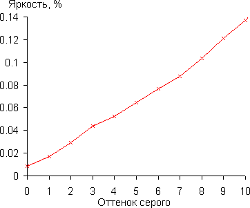 Для оценки характера роста яркости на шкале серого мы измерили яркость 256-ти оттенков серого (от 0, 0, 0 до 255, 255, 255). График ниже показывает прирост (не абсолютное значение!) яркости между соседними полутонами.