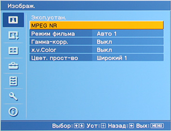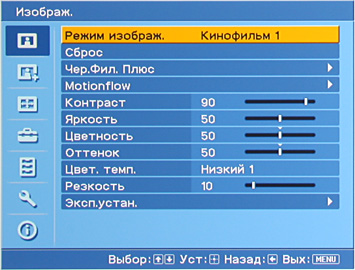 Настройка Цвет. прост-во влияет на цветовой охват. В реальности можно оставить ее на Широкий 1 или Широкий 2, так как при этом цвета становятся жуть живее, но еще не выглядят попугайскими. При включенном x.v.Color поддерживается цветовое пространство xvYCC. Параметр Проекц. Кино (Film Projection) управляет функцией имитации кинопленки, а Улучш. движ (Motion Enhancer) — вставкой промежуточных кадров. (В зависимости от текущего режима и типа подключения некоторые настройки могут быть недоступны.) Выбрав для параметра Рег. Лампы значение Низкий, можно уменьшить яркость лампы, а заодно и шум от системы вентиляции. Сочетания настроек хранятся в пяти предустановленных, но редактируемых профилях (настройки изображения сохраняются для каждого типа подключения), и в одном пользовательском профиле.