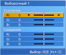 Стандартный набор настроек — Контраст, Яркость, Цветность (насыщенность), Оттенок, Цвет. темп. (Высокий, Средний, Низкий 1, Низкий 2и 5 настраиваемых профилей с регулировкой усиления и смещения трех основных цветов) и Резкость —