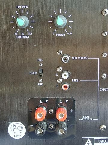 На задней панели сабвуфера расположены разнообразные разъемы для подключения источника звука (усиленный, отфильтрованный и линейный вход), регуляторы громкости, частоты среза фильтра низких частот и двухрежимный переключатель фазы.