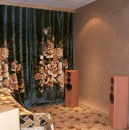 Окей, измеряем. Однако и тут не всё просто: нельзя точно измерить колонки класса Hi-Fi, избавившись полностью от влияния акустических свойств помещения. И даже если измерить характеристики в чистом поле или в полностью безэховой камере, такие результаты не будут являться адекватными. Ведь эксплуатироваться колонка будет скорее всего в обычном, не слишком заглушенном помещении. Эту дилемму мы решаем, производя измерения в специально оборудованной заглушенной комнате площадью 12 кв. м. С одной стороны, это не специализированная измерительная безэховая камера, с другой — пустая комната с внутренним звукопоглощением, эффективно подавляющим переотражения на всех частотах выше 35 Гц. В ней установлен только мягкий диван для слушателя (в том числе, служащий для исключения симметрии внутреннего объёма). Наши измерения студийных мониторов в таких условиях с погрешностью в 1-2% совпали с их паспортной АЧХ. Таким образом, приведённые АЧХ колонок достаточно корректны для целей ознакомления, при этом, условия измерений приближены к условиям их идеальной эксплуатации: подобную же звукопоглощающую отделку помещения (искусственная вата, плитка из минеральной соли, двухслойное толстоворсовое покрытие) применяют при обустройстве домашних кинотеатров класса Hi-Fi/Hi-End.