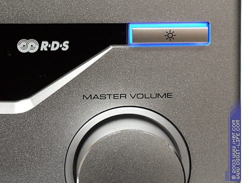 Вот собственно и всё, что есть на передней панели. Подавляющее большинство функций аппарата можно задействовать только с пульта управления. Что касается подсветки, то здесь возможны только два варианта: в обычном режиме две кнопки по бокам дисплея подсвечиваются сине-фиолетовым свечением, либо можно выключить подсветку кнопок, однако в этом случае и дисплей светится менее интенсивно. Первый режим хорош для повседневной жизни. Если же вы захотите сосредоточенно послушать музыку или в полной темноте насладиться кинофильмом, то отсутствие дополнительной иллюминации окажется весьма кстати. Изменить режим подсветки можно с помощью отдельной кнопки.