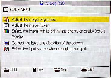 Некоторые часто используемые функции вызываются напрямую: при помощи кнопок на проекторе или на пульте. Гораздо большее число настроек доступно через экранное меню. Для навигации по меню используется целых 7 кнопок (MENU, ENTER, EXIT, стрелки вверх-вниз, вправо-влево) — явно можно было сделать все более простым и удобным. Однократное нажатие на кнопку MENU вызывает краткое (обзорное) меню, где находятся только самые нужные с точки зрения разработчиков пункты.