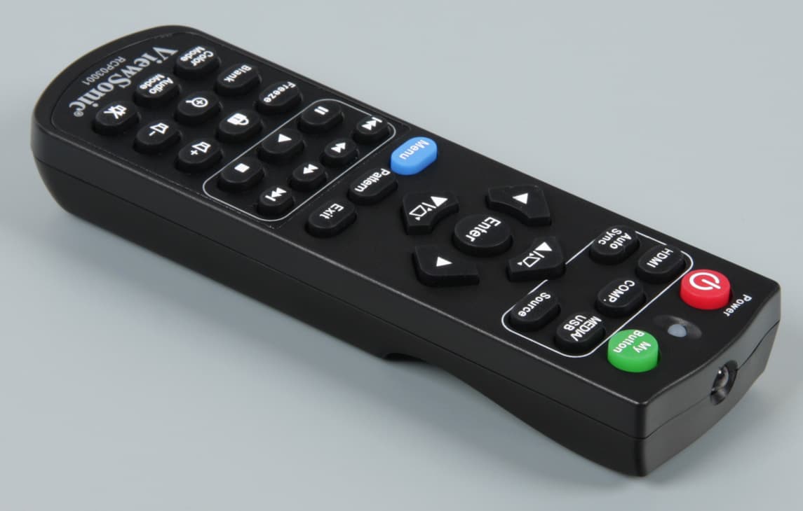 Пульт небольшой, но зато он «настоящий», а не крохотуля размером с кредитную карточку и с жутко неудобными кнопками. Можно простить и не очень крупные кнопки (из резиноподобного материла), и то, что расположены они тесновато. Корпус пульта изготовлен из черного пластика с матовой поверхностью. Питается пульт от двух элементов питания AAA.