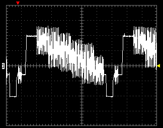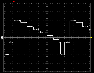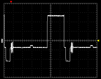 Первая осциллограмма показывает уровень шума видеоЦАПа плеера. Тестовая картинка содержит черное и белое поля, черное поле имеет вертикальную полосу с увеличением яркости в 10%.