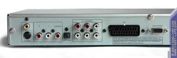 На задней стороне плеера имеются следующие разъёмы: видео — композитный, S-Video, SCART (со всеми выведенными сигналами, в том числе RGB), D-SUB для подключения VGA-монитора; аудио — стерео RCA, аналоговый 5.1, коаксиальный и оптические цифровые выходы. Компонентный видеовыход YPbPr отсутствует. Вывод видеосигналов S-Video, RGB и VGA — взаимоисключающий. Активный видеовыход выбирается в меню.
