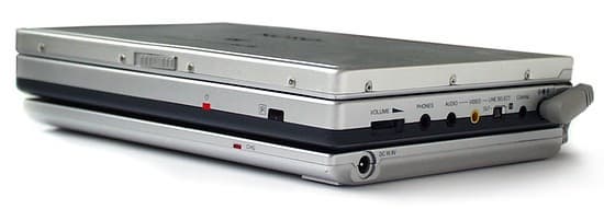 На передней панели расположены светодиод активности диска и приемник ИК сигнала пульта. На левой торцевой стороне находится движок включения-выключения. На правой торцевой стороне — регулятор громкости, выход для стереонаушников, аудио и видео входы/выходы, переключатель работы на вход или на выход, коаксиальный аудиовыход и разъём питания.