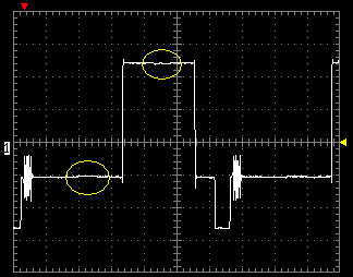 Вторая осциллограмма показывает уровень шума ЦАПа плеера. Тестовая картинка содержит черное и белое поле, имеющие вертикальные полосы с отклонением яркости в 1%. Желтым цветом на осциллограмме отмечены места расположения полос.