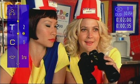 Переход к соответствующей иконке с помощью курсорных стрелок вверх-вниз последовательно активирует режимы перехода к нужному разделу или главе, выбора аудиодорожки, субтитров и т. д. К некоторым пунктам меню есть быстрый доступ с помощью кнопок пульта — T/C (выбор раздела / главы), AUDIO (аудиодорожки), SUBTITLE (субтитров) и т. д.