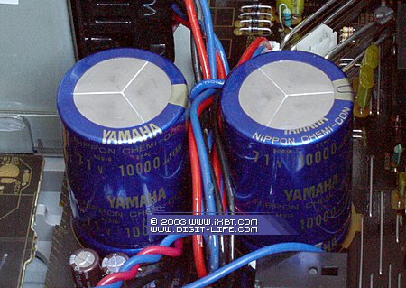 В сглаживающем фильтре блока питания применяются два конденсатора Yamaha, но уже большей ёмкости — по 10000 мкФ каждый.
