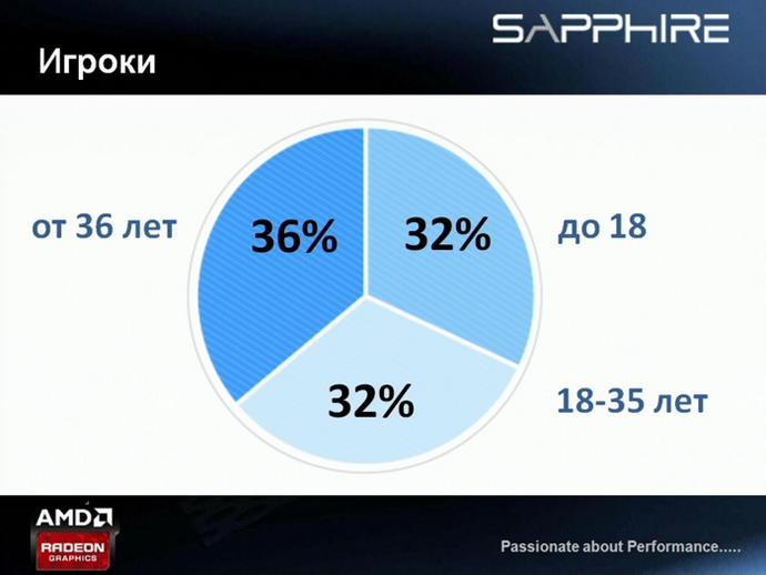 Менеджер компании Sapphire по продажам в России Елена Зарубина, построила свой доклад на исследовании потребительского рынка геймеров: из социально-демографической составляющией и продпочтений.