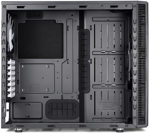 Для улучшения звукопоглощения в корпусе используется специальное покрытие и заглушки. Снижению шума также способствует комплектация двумя малошумящими вентиляторами Fractal Design Dynamic GP14 типоразмера 140 мм. В общей сложности в корпусе можно установить до девяти вентиляторов, а также СВО с радиаторами самых разнообразных размеров. Максимально допустимая высота процессорного охладителя — 180 мм.