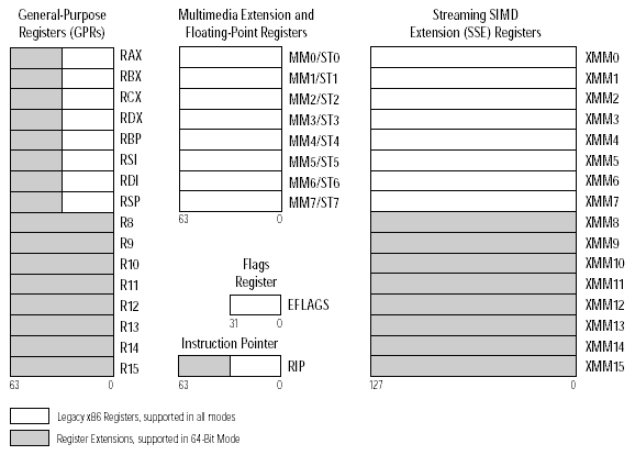 - Все регистры общего назначения расширены до 64 бит (RAX=R1, включает EAX, AX, AH и AL; RBX=R2, RCX=R3 и т. д.);