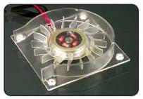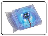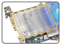 Также новый вариант OTES имеет встроенные светодиоды, обеспечивающие подсветку карты, что должно быть благосклонно принято любителями моддинга. Кроме привлечения внимания, вентилятор прекрасно охлаждает радиатор :-). Сам кулер состоит из Beetle Tube (трубы для жучков) и Super Fan (супер вентилятора). Дополнительные отверстия в Beetle Tube выравнивают давление воздуха, что способствует снижению шума за счет снижения сопротивлению потоку воздуха. Наши собственные измерения показали, что уровень шума нового варианта OTES находится в районе 25—26 дБ, в то время как референсное охлаждение от NVIDIA у карты на базе FX 5800 шумит на уровне 63—65 дБ.