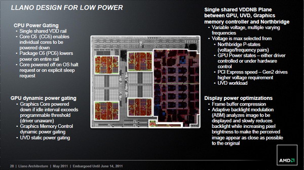 Но это вполне ожидаемо, поскольку даже Brazos досталась достаточно мощная графика, как демонстрировали тесты. Для ее раскрытия в играх не хватало мощности именно вычислительного ядра. И если для нетбуков это нормально, то полнофункциональные ноутбуки должны отрабатывать и в играх, да и в других ресурсоемких приложениях. Поэтому вычислительная часть представлена ядрами, спроектированными по текущей «настольной» архитектуре (K10 с доработками). И в процессорах будет до 4 таких ядер. Это основное отличие от Brazos, у которого вычислительные ядра имеют особую «миниатюрную» архитектуру.