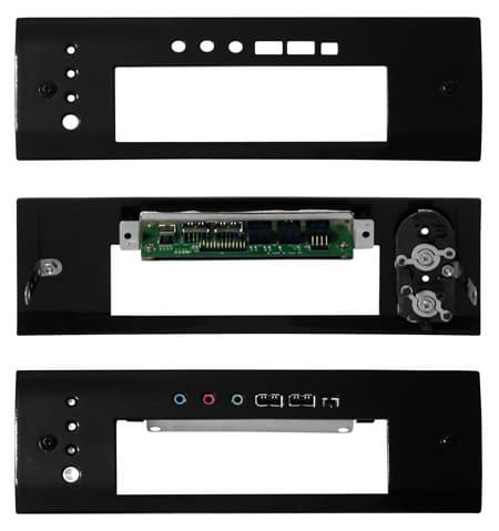 - собираем декоративную панель (закрепляем кнопки и интерфейсные разъемы, а также элементы крепления), ставим ее на место кассетной деки и подключаем компоненты к системной плате;