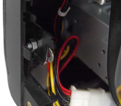 Так как корпус музыкального центра не рассчитан на размещение в нем дополнительных компонентов, то пришлось задуматься о дополнительной вентиляции. Для этого, помимо вентиляционного отверстия, на задней стенке корпуса был установлен 12 мм кулер, нагнетающий воздух в корпус, и сделано дополнительное отверстие на боковой стенке (слева), рядом с жестким диском.