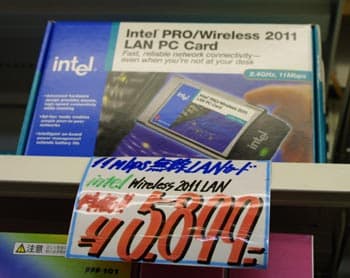 с различной технологической мелочевкой: мобильными телефонами, минидиск- и компакт-диск-плеерами, наушниками, маленькими ЖК телевизорами и (видимо это хит сезона) всевозможными миниатюрными (как правило CF и CardBus) радиокартами. Причем, продаются не только 802.11а/b но и более «самопальные», местного стандарта изделия со скоростью порядка 128 или 256 килобит (чем то похожие на AirPort).