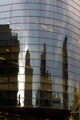 Для начала давайте спокойно прогуляемся по центральной улице квартала. В красивых высотных зданиях отражаются еще более красивые и высотные: