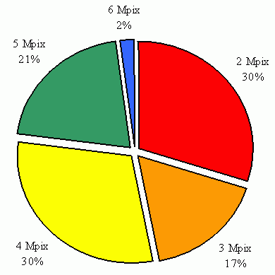 Уже совсем не продаются 1 Мегапиксельные камеры, их место заняли 2 мегапиксельные решения. Значительную часть в общем обьеме продаж занимают трехмегапиксельные устройства, также немаловажен тот факт, что постепенно увеличивается спрос на шестимегапиксельные фотокамеры.