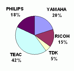 Рынок CD-RW дисководов, возможно и не столь прибылен, нежели DVD, тем не менее, это один из наиболее активно растущих рынков на сегодняшний день. И объемы продаж CD-RW устройств с каждым днем растут. По прогнозам специалистов компании в 2002 году объемы продаж рекордеров составят 56 млн. шт.