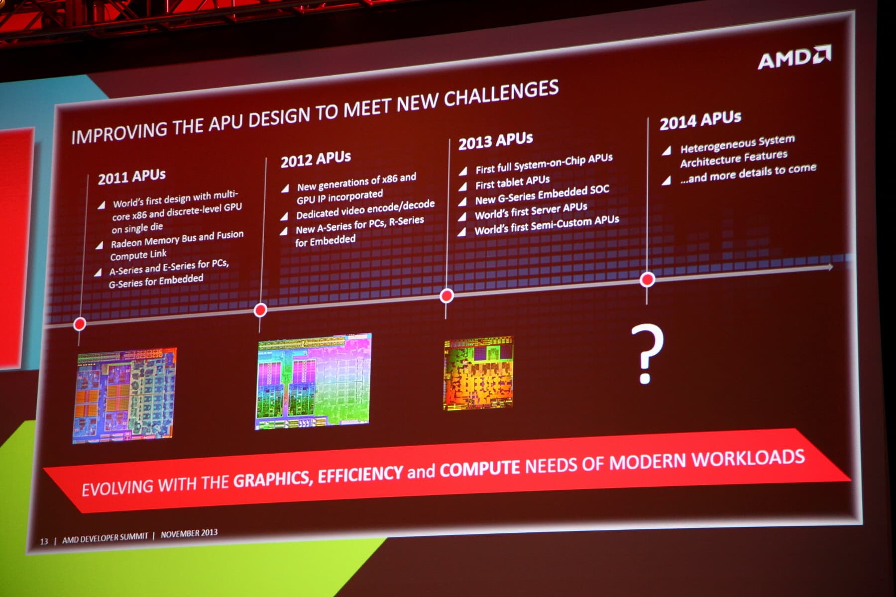 На протяжении 2013 года вышли новые модели APU — полноценные системы-на-чипе, APU для планшетов, серверные APU и другие чипы, но в 2014 дело продолжат новые APU с улучшенными возможностями гибридных вычислений. Поэтому самым важным событием в рамках APU13 стал анонс гибридных процессоров следующего поколения. В следующем году на рынок выйдут новые модели APU, однокристальные системы и APU для планшетов, серверные APU и другие модели, с улучшенными возможностями по гибридным вычислениям, имеющие совершенно новые возможности, такие как доступ к общей памяти для CPU и GPU.