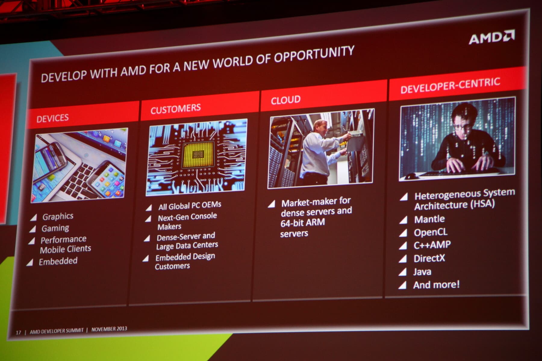 Как видно по слайдам, в AMD надеются на применение их решений уже не только и не столько в настольных и мобильных ПК, но в других популярных сейчас устройствах: мобильных решениях и игровых консолях, к примеру. Но и про персональные компьютеры в AMD не забывают, напоминая об успешном запуске новых графических решений серии AMD Radeon R9 290X с их новыми возможностями и отличным соотношением цены и производительности.
