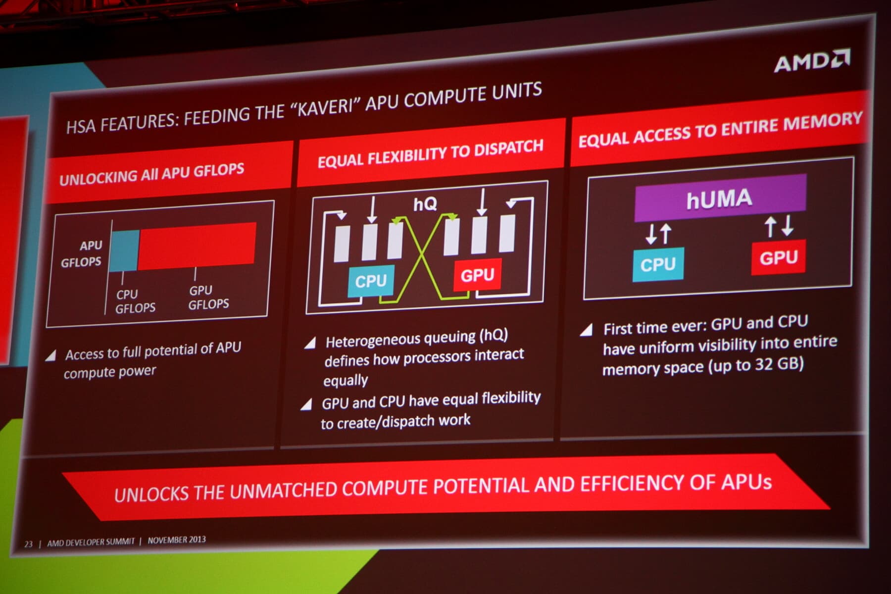 Конференция разработчиков APU13 получила звание «Эпицентра гетерогенных вычислений», она открыта для всех желающих и включает ключевые доклады руководителей множества компаний, таких как AMD, ARM, Oracle, Mediatek, Imagination, Sony, DICE и многих других, посвященные гетерогенным и облачным вычислениям, а также предлагает обучающие сессии, возможности по обмену опытом, демонстрацию новейших технологий, взаимодействие с техническими разработчиками, научными специалистами и инвесторами, а также возможность получения другой информации, полезной при работе с гетерогенными системами.