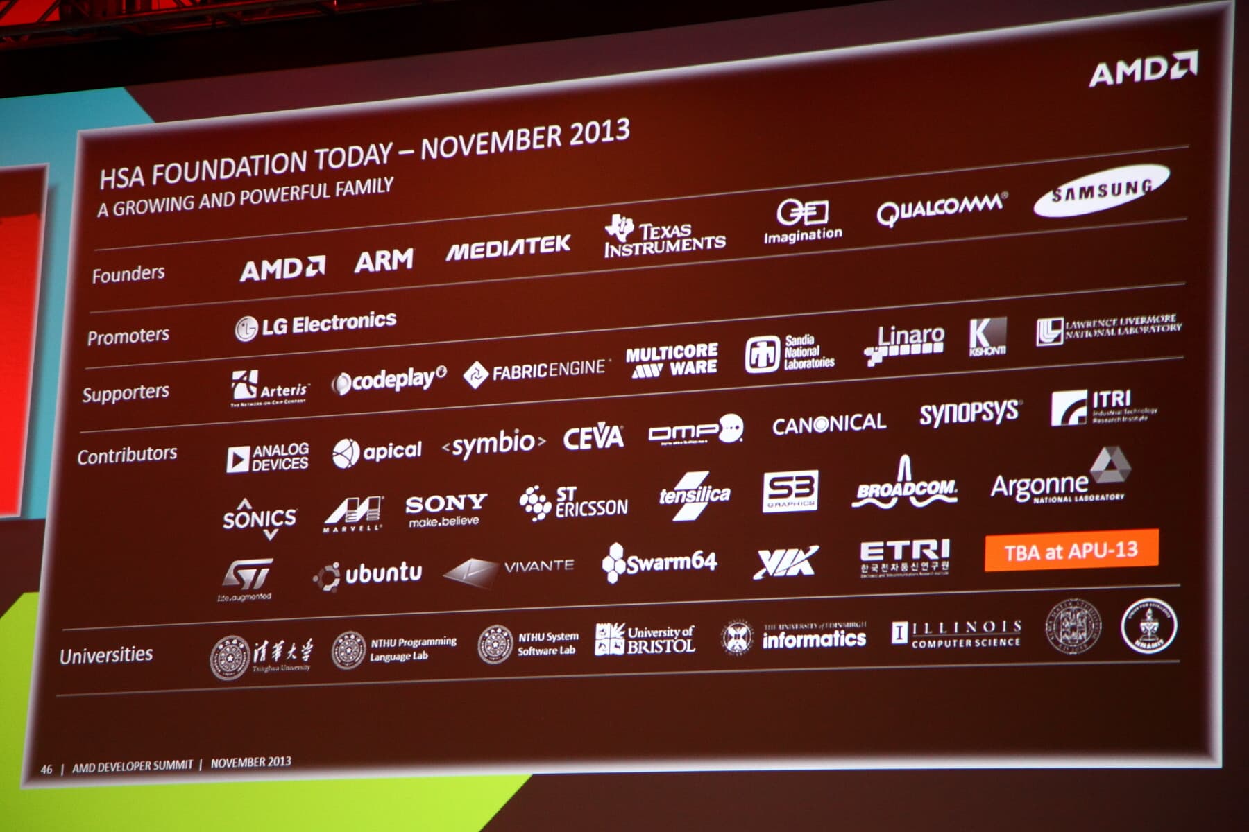 Кроме Oracle, к HSA Foundation в дни проведения саммита AMD APU13 присоединились и другие компании, такие как Broadcom, Oak Ridge National Laboratory, Electronics and Telecommunications Research Institute, Kishonti, VIA Technologies и Huawei — все они заинтересованы в улучшении открытых стандартов, предназначенных для гетерогенных вычислений.