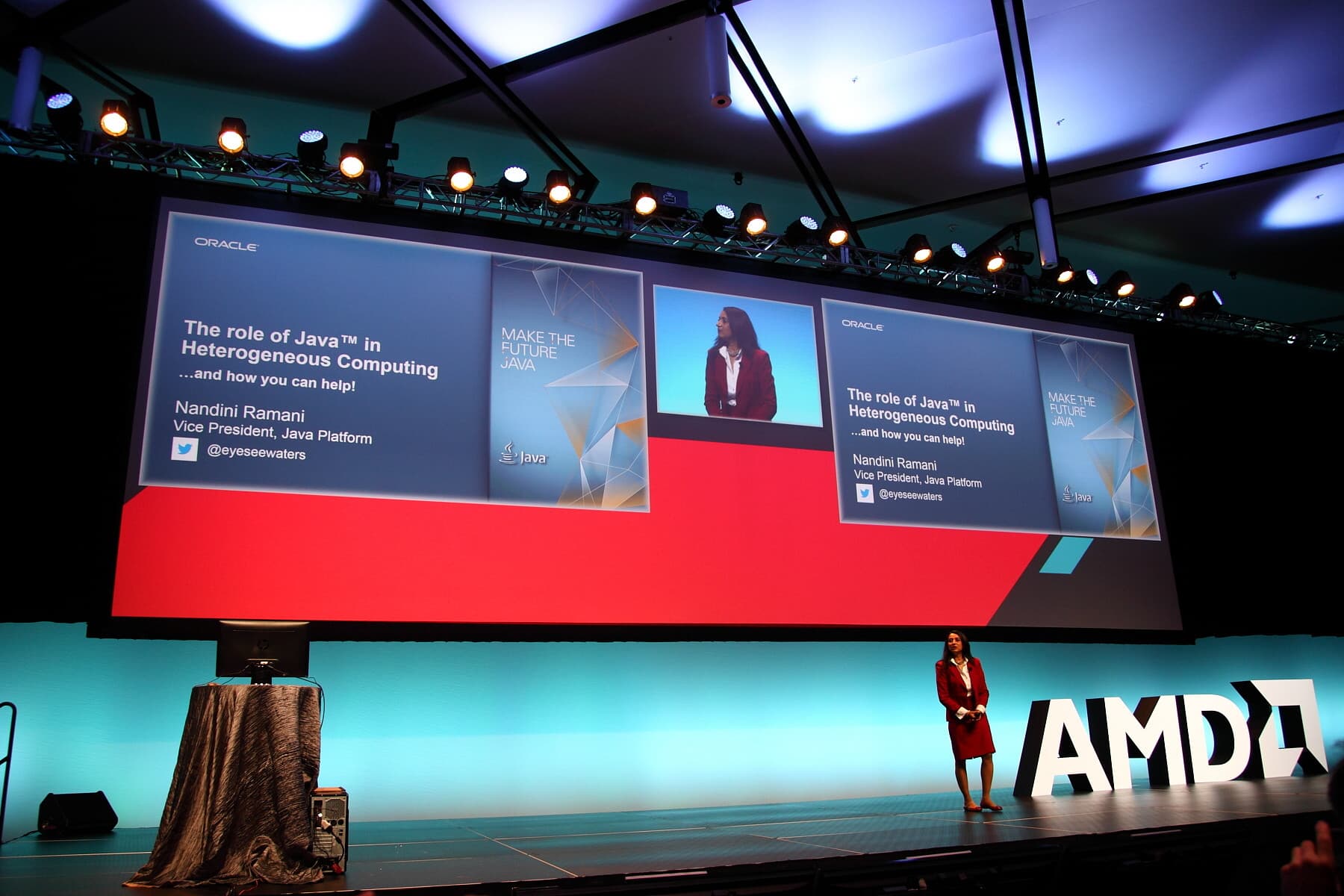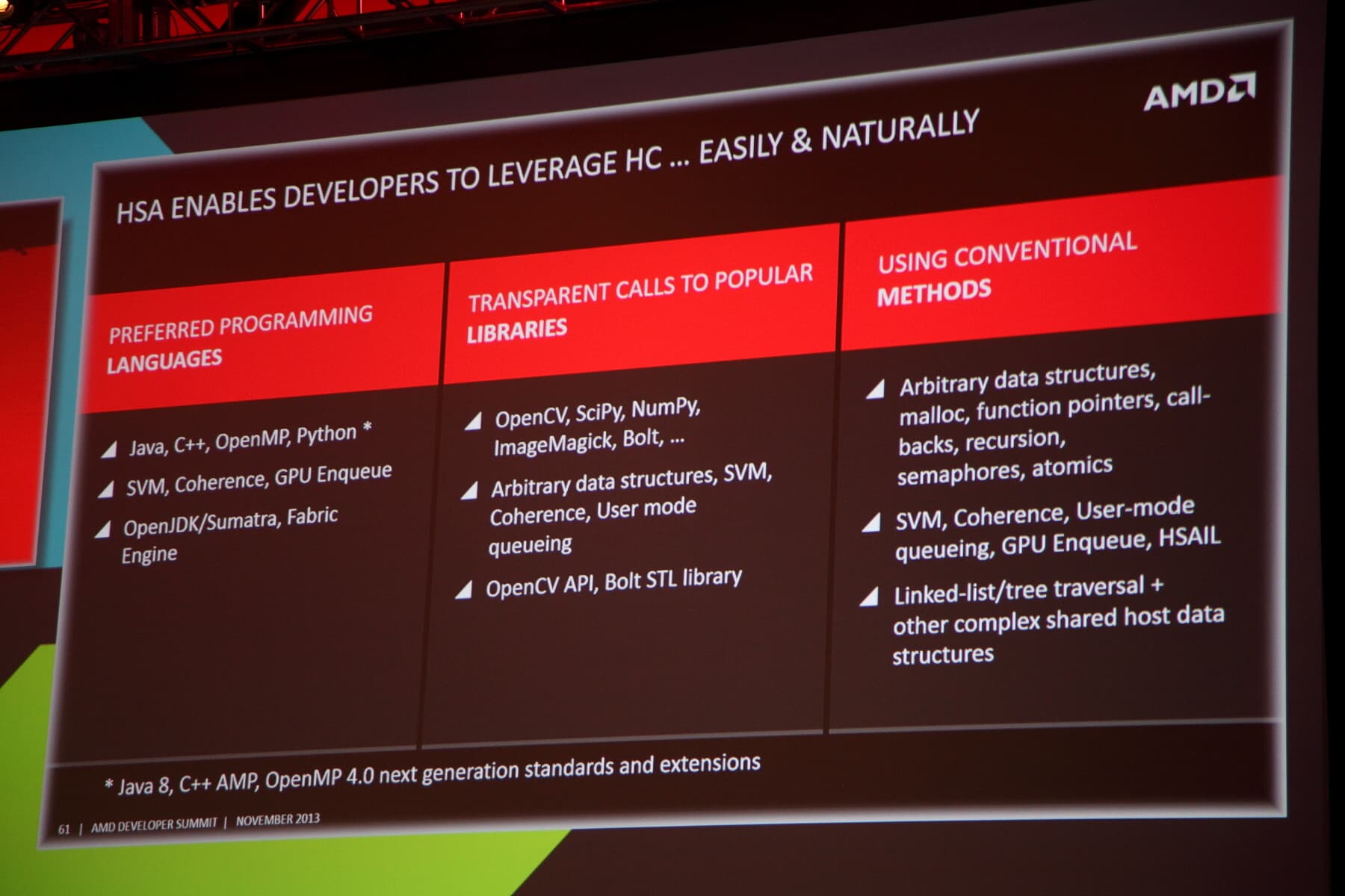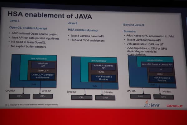 Но главным анонсом выступления Нандини стало объявление о присоединении компании Oracle к консорциуму HSA Foundation. Представительница Oracle сказала, что вступление в состав HSA представляет для компании следующий шаг на пути гетерогенных вычислений, а также внедрения новых парадигм серверных и облачных вычислений. Совместная работа Oracle с HSA Foundation поможет обеспечить Java-разработчиков возможностью ускорения гетерогенных вычислений на решениях компании AMD, а также помочь им разобраться с тем, как применить эти возможности в рамках Java Virtual Machine (JVM) и языка Java.