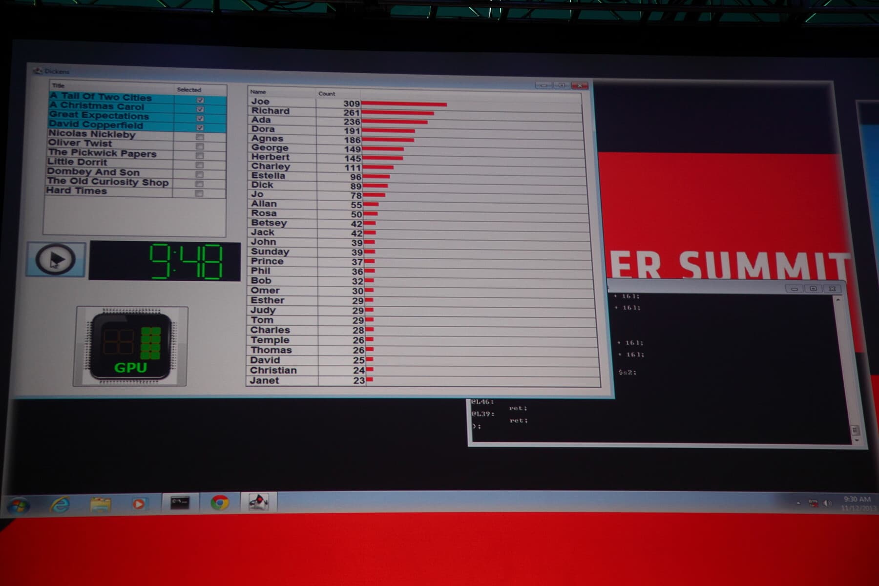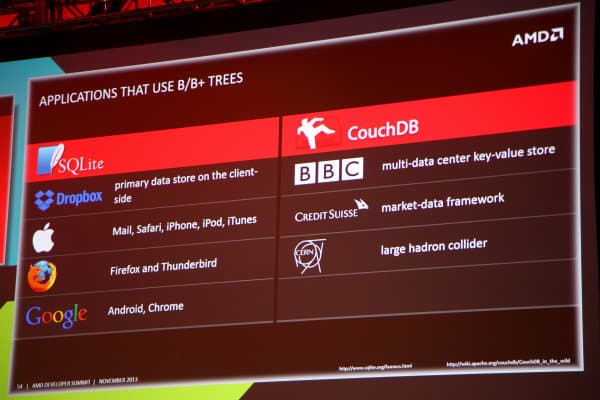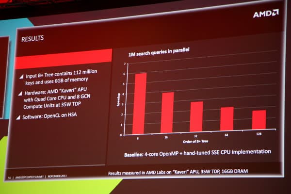 Совместно с представителями AMD они показали демонстрационную программу, использующую эти возможности — при выполнении поиска по базе данных, исполнение программы на CPU заняло почти 45 секунд, тогда как применение GPU позволило ускорить задачу в несколько раз — менее чем до 10 секунд. И это — без применения сложного низкоуровневого программирования!