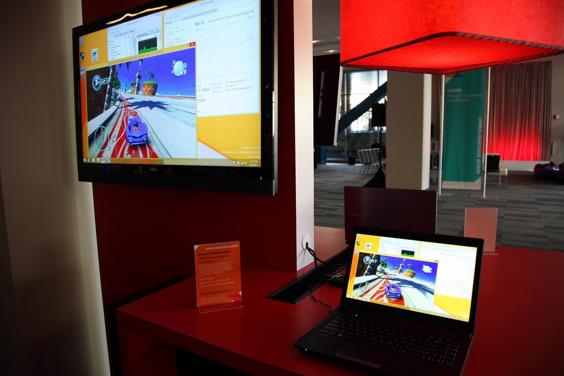 Кроме этих самых интересных стендов на выставке были представлены и более привычные технологии и решения. К примеру, внимание привлёк стенд, показывающий работу AMD Wireless Display, который будет поддерживаться мобильными решениями AMD. Эта технология использует отраслевой стандарт Miracast, для работы AMD Wireless Display нужен только совместимый беспроводной приемник на стороне дисплея, совместимый с Miracast. По нашим замерам, задержка изображения на внешнем устройства при таком подключении составляла меньше полусекунды.