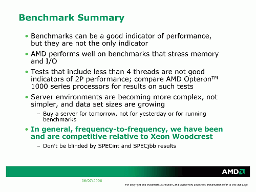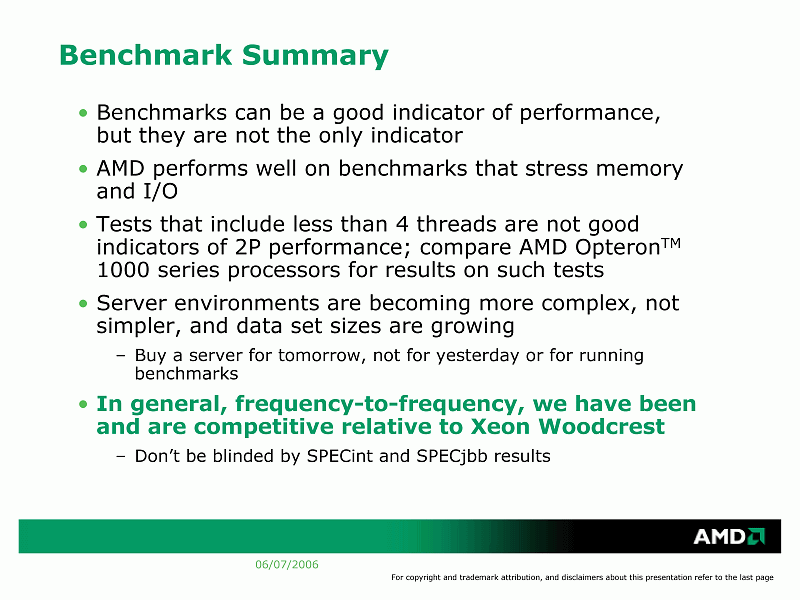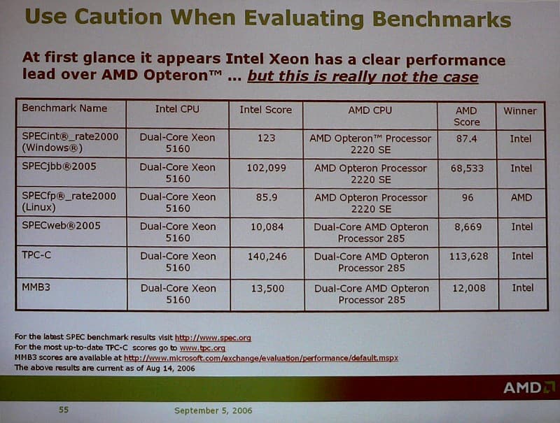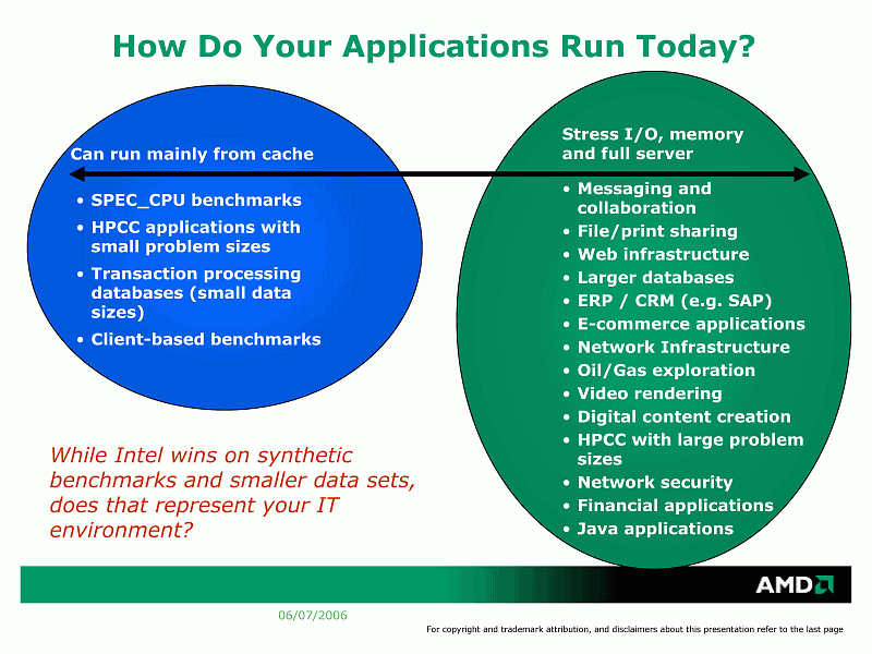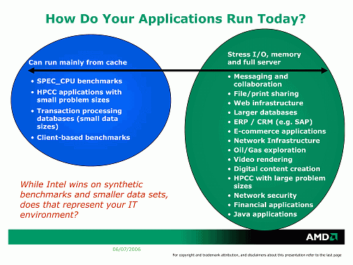 Использовать по возможности расширенный набор тестов, куда помимо синтетики, измеряющей чистую производительность микроархитектуры процессора (и с этой целью оптимизируемой для «целикового» помещения в кэш-память), войдут и тесты, основанные на приложениях и имитирующих реальные условия работы сервера и реалистичную нагрузку. Звучит, при вполне естественной конъюнктурности (такая позиция на сегодня выгодна для AMD), достаточно здраво.