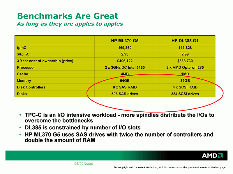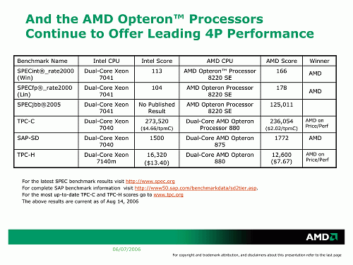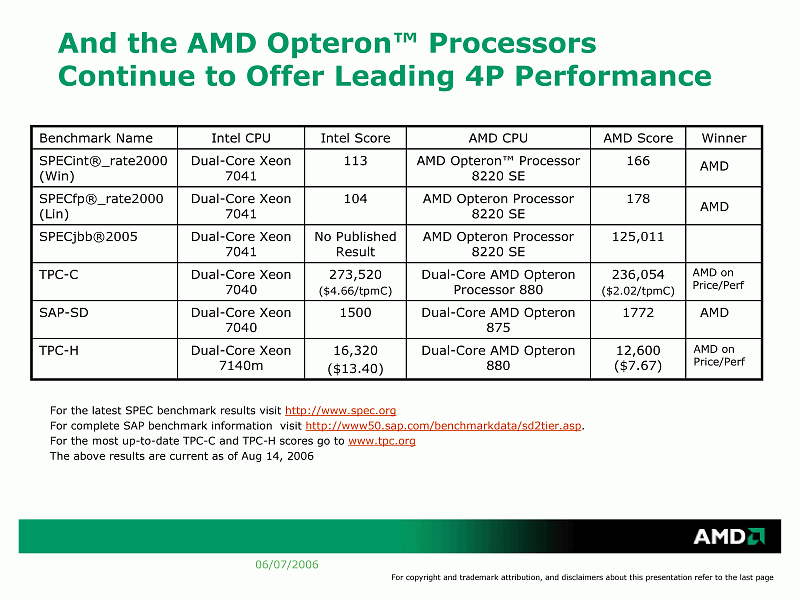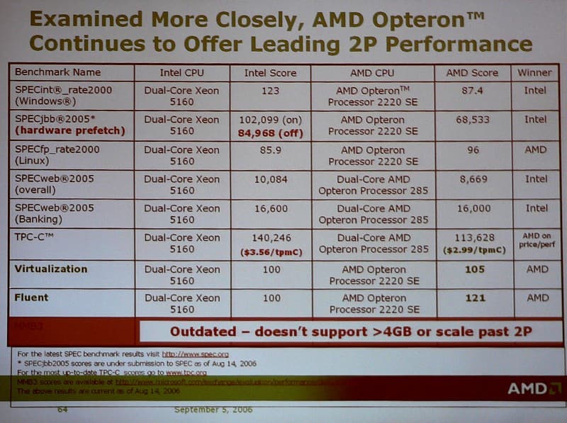 В результате можно, при желании, «подобрать» достаточно представительный набор тестов, особенно из категории «научно-производственных» вычислений (HPCC), согласно которым семейство Opteron выиграет у обновленных Xeon за счет платформенных особенностей, несмотря на отставание в чистой производительности ядра процессора. А для серверов, работающих в режиме виртуализации, преимущество Opteron объясняется аппаратной поддержкой механизма разделения памяти за счет все того же интегрированного контроллера.