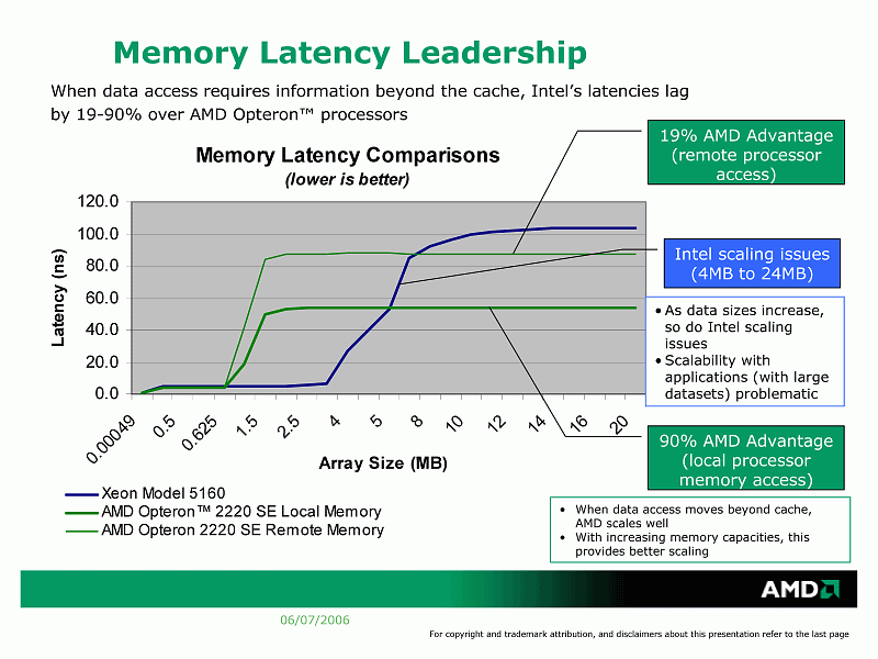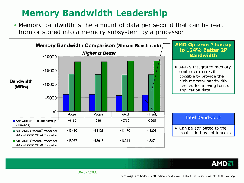 Пропускная способность подсистемы памяти на AMD-платформе также выше и масштабируется с ростом числа процессоров, чего нельзя сказать об интеловской платформе.