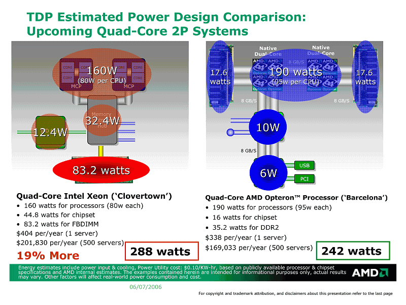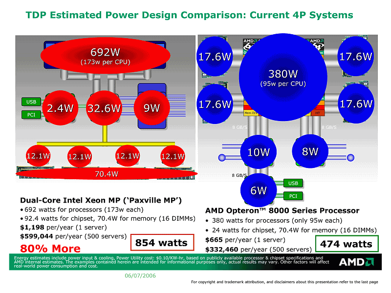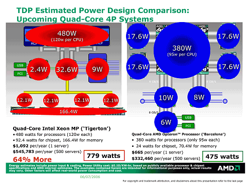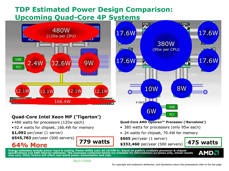 В многопроцессорном сегменте разница опять существенная. И здесь AMD, похоже, действительно не грозит конкуренция со стороны Intel в ближайший год, в том числе, и по экономичности.