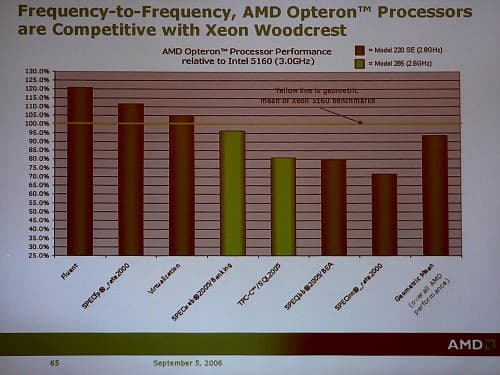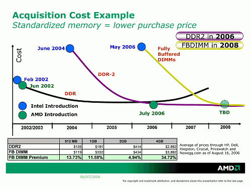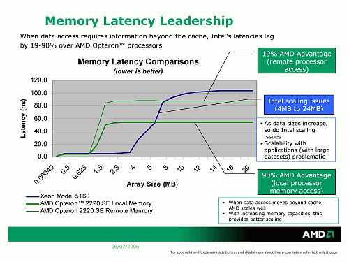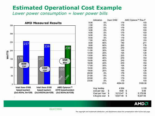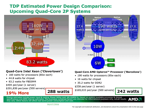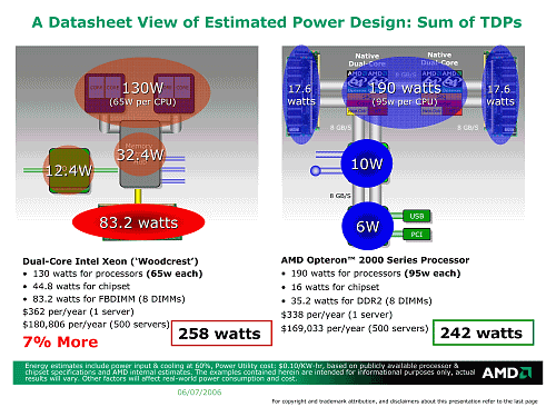 Следующим пунктом программы надлежало разобраться с энергопотреблением. И, как уже упоминалось, в этом деле «неоценимую помощь» маркетологам AMD оказывает избранный Intel для своей новой платформы стандарт памяти — FBDIMM. Отличающийся от DDR2 не только более высокими задержками при обращении, но и высоким потреблением энергии (по вине управляющей электроники, установленной на каждом модуле). Установки восьми таких модулей вполне достаточно, чтобы покрыть разницу в TDP двух процессоров Opteron по сравнению с двумя Woodcrest.