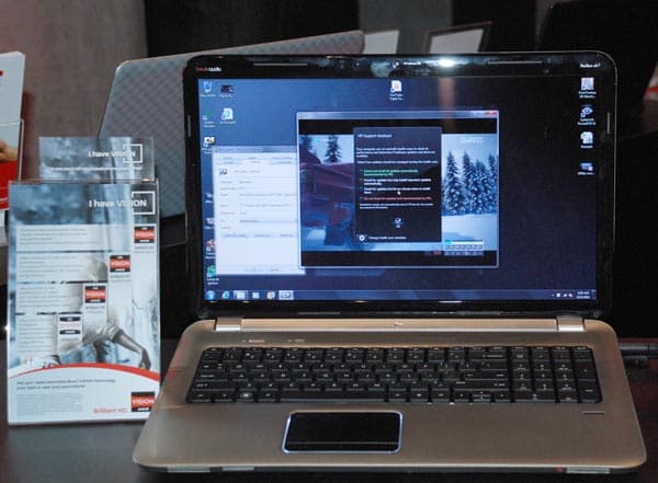 Образцов было много. В отдельном помещении находились те, о которых мы сможем рассказывать лишь немного позже, когда закончится срок действия соглашения о неразглашении, подписанного всеми участниками. Что касается уже «рассекреченных» образцов, к наиболее интересным из них относится ноутбук HP Pavilion dv7 на четырехъядерном процессоре A8-3530MX с 17-дюймовым экраном. В конфигурацию этого компьютера включен дискретный GPU, который работает в паре с APU (технология Dual Graphics). Графическая подсистема получила обозначение AMD Radeon HD 6755G2 и включает 1,5 ГБ памяти.