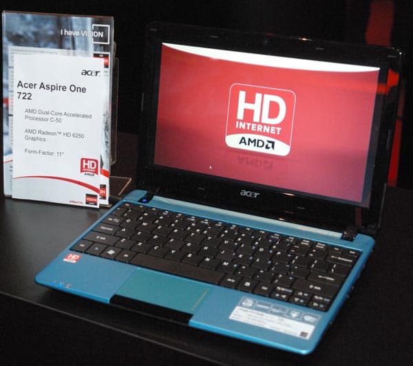 Нетбук Acer Aspire One 722. Основой этого компьютера стал APU C-50 с интегрированным GPU AMD Radeon HD 6250. Размер экрана — 11 дюймов.