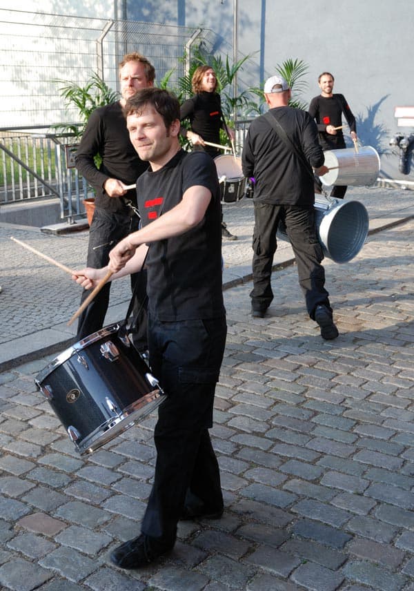 Ужин, откровенно говоря, оказался на любителя. Это касается и музыкального сопровождения, которое, впрочем, заслуживает упоминания в силу его оригинальности. Приглашением к столу стало выступление перкуссионного квинтета. Жизнерадостным грохотом также была заполнена пауза перед подачей основного блюда. Впрочем, желающие сберечь свои барабанные перепонки имели возможность выйти во двор.