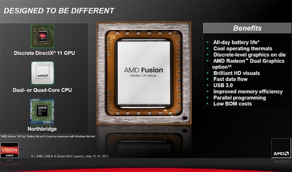 Среди достоинств APU, перечисленных производителем, следует выделить возможность мобильного компьютера работать автономно в течение всего дня (не менее 8 часов), малое тепловыделение, высокую производительность графической подсистемы, поддержку совместного использования интегрированного и дискретного GPU (Dual Graphics), поддержку видео высокой четкости и поддержку USB 3.0.