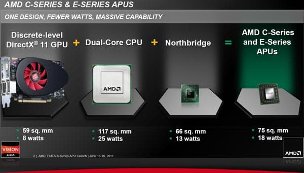 Компания уже продала более 5 млн. APU этих серий, представленных сравнительно недавно. По данным компании, они выбраны более чем для 165 моделей мобильных и настольных ПК. Секрет успеха — в выигрыше, который обеспечивает применение APU. Как видно на слайде, APU мощностью 18 Вт заменяет три компонента суммарной мощностью 46 Вт. При этом стоимость APU меньше, чем стоимость этих компонентов, да и на печатной плате он занимает куда меньше места.