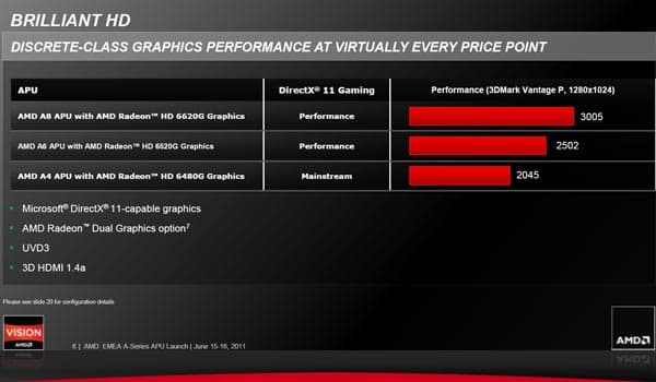 В состав GPU входит до 400 потоковых ядер. APU A4 получил графический процессор AMD Radeon HD 6480G. Модели APU A6 достался графический процессор AMD Radeon HD 6520G. В конфигурацию APU A8 входит графический процессор AMD Radeon HD 6620G. О производительности этих решений дает представление следующий слайд.