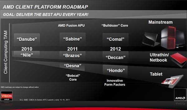 В заключение господин Макри рассказал о планах компании на будущий год. В верхнем сегменте, объединяющем настольные системы, ноутбуки с большими экранами и моноблочные ПК, вслед за платформой Sabine появится платформа Comal. В сегменте ультратонких ноутбуков и нетбуков преемницей Brazos станет платформа Deccan. На набирающий популярность сегмент планшетов (платформа Desna) нацелена платформа Hondo.