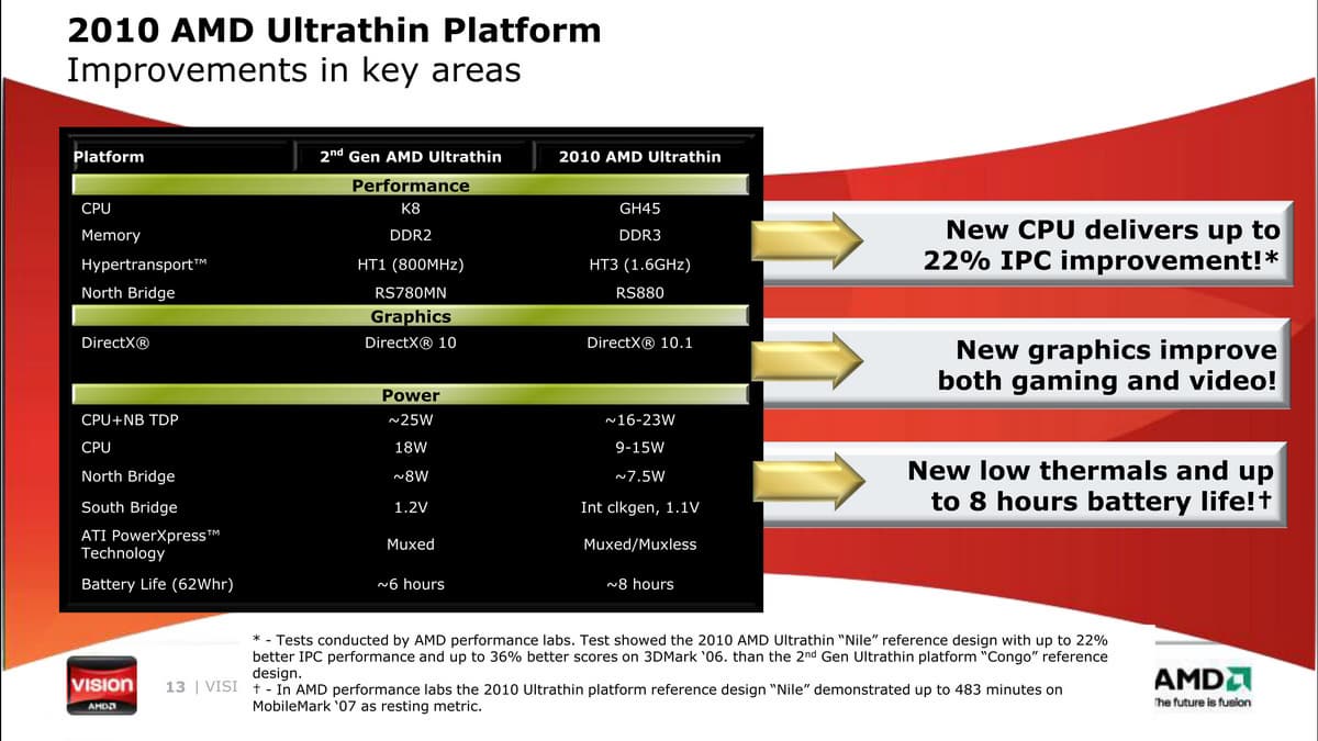 Достигнуть обещанное выше, с технической точки зрения, должны помочь процессоры с TDP в пределах 9-15 Вт, из новых семейств Athlon II Neo и Turion II Neo, помимо более производительных ядер, они принесут с собой также поддержку DDR3 и удвоенную частоту HT-шины. Графическое ядро получит поддержку DirectX 10.1 и будет прямым аналогом, используемого в современных чипсетах для настольной платформы (AMD 880G). Звучит очень убедительно, ведь, напомним, речь идет о начальном сегменте (с точки зрения производительности).